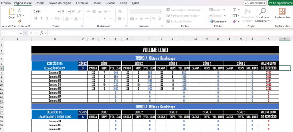 Ao preencher o peso utilizado e a quantidade de repetições em cada série, a planilha calcula automaticamente o volume do exercício.